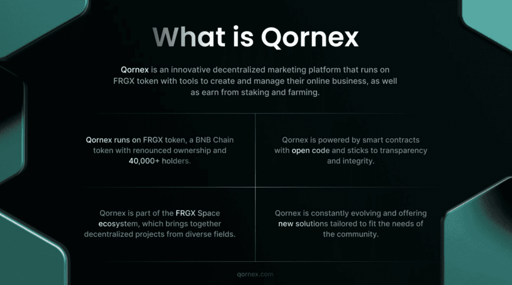 Qornex is a pioneering decentralized marketing platform that leverages the innovative FRGX token to empower users to manage their online businesses and simplify staking and farming.