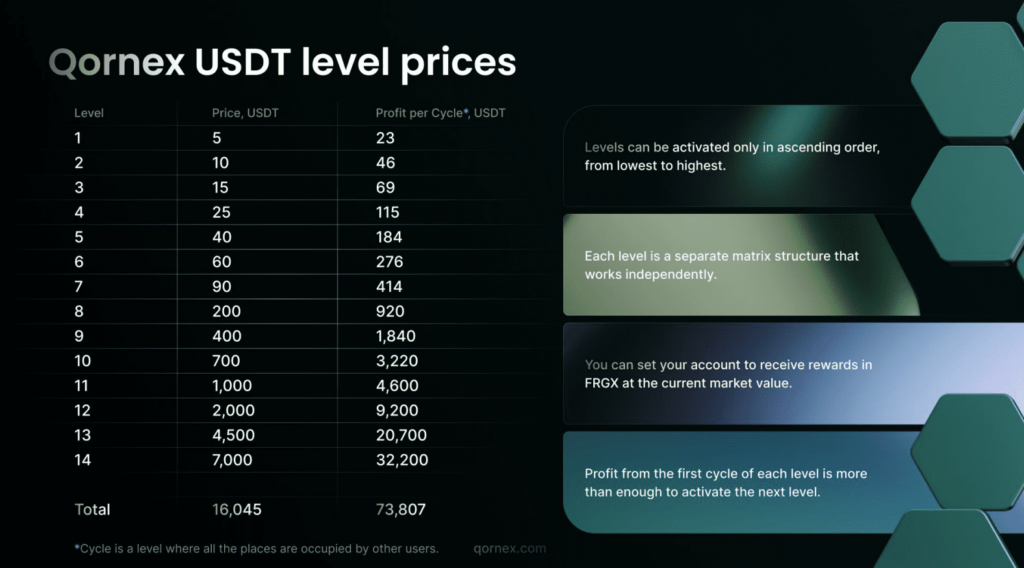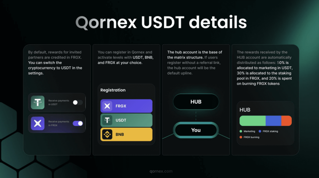 Users can register on Qornex and activate levels using USDT, BNB, or FRGX tokens, tailoring their engagement preferences.